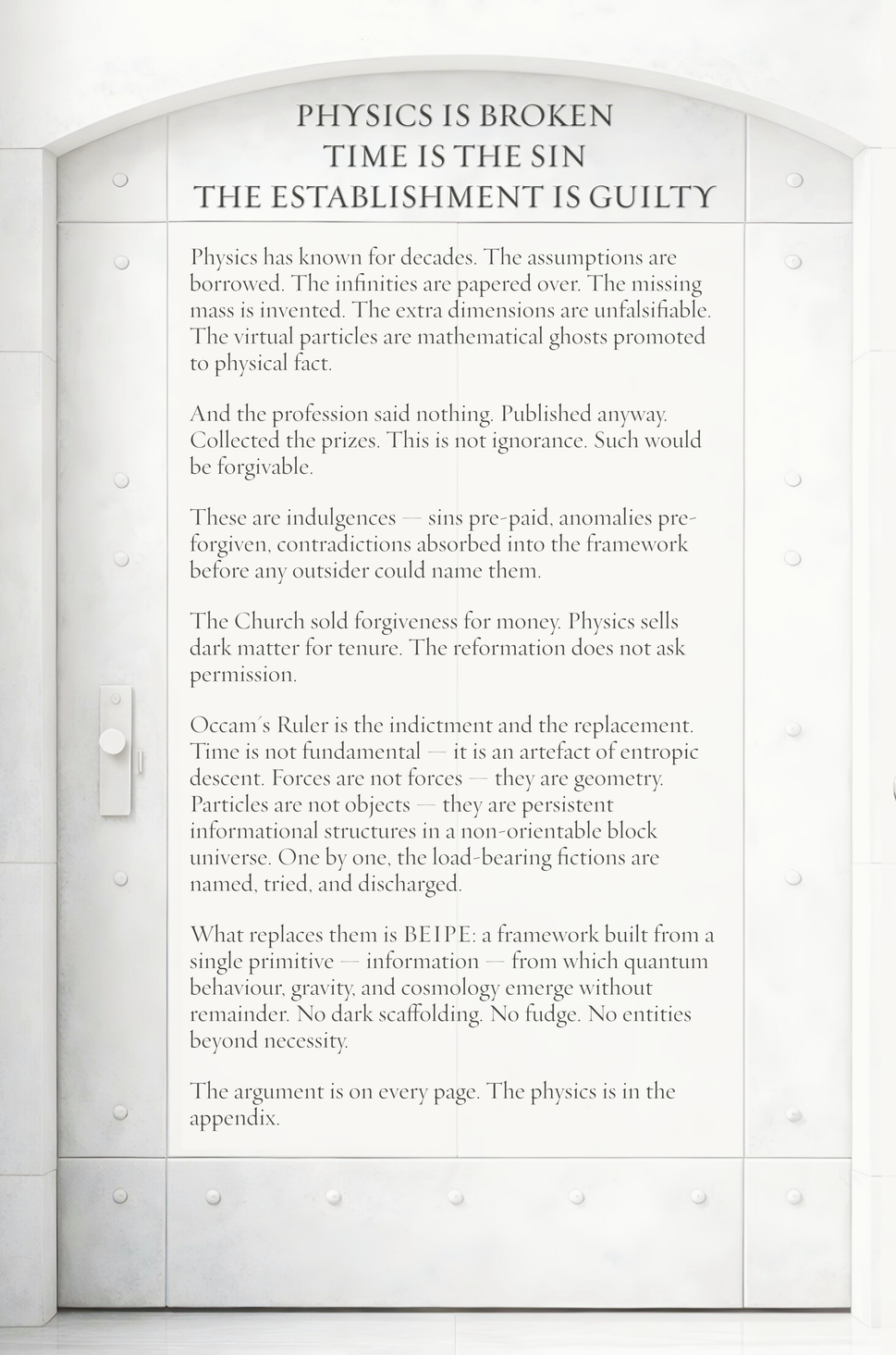 But here’s what makes the book dangerous: he doesn’t stop at the demolition. He offers a replacement — BEIPE — that is so elegantly simple it feels illegal. One primitive (information), one topology (a non-orientable Mobifold block), and one dynamic (a scalar Entropic Gradient ∇S generated by a neutrino skein). That’s it. Time, gravity, quantum weirdness, forces, cosmic expansion, even life — everything falls out as deterministic geometric descent in a fixed 4D structure. No extra dimensions. No tunable parameters. No invisible friends.