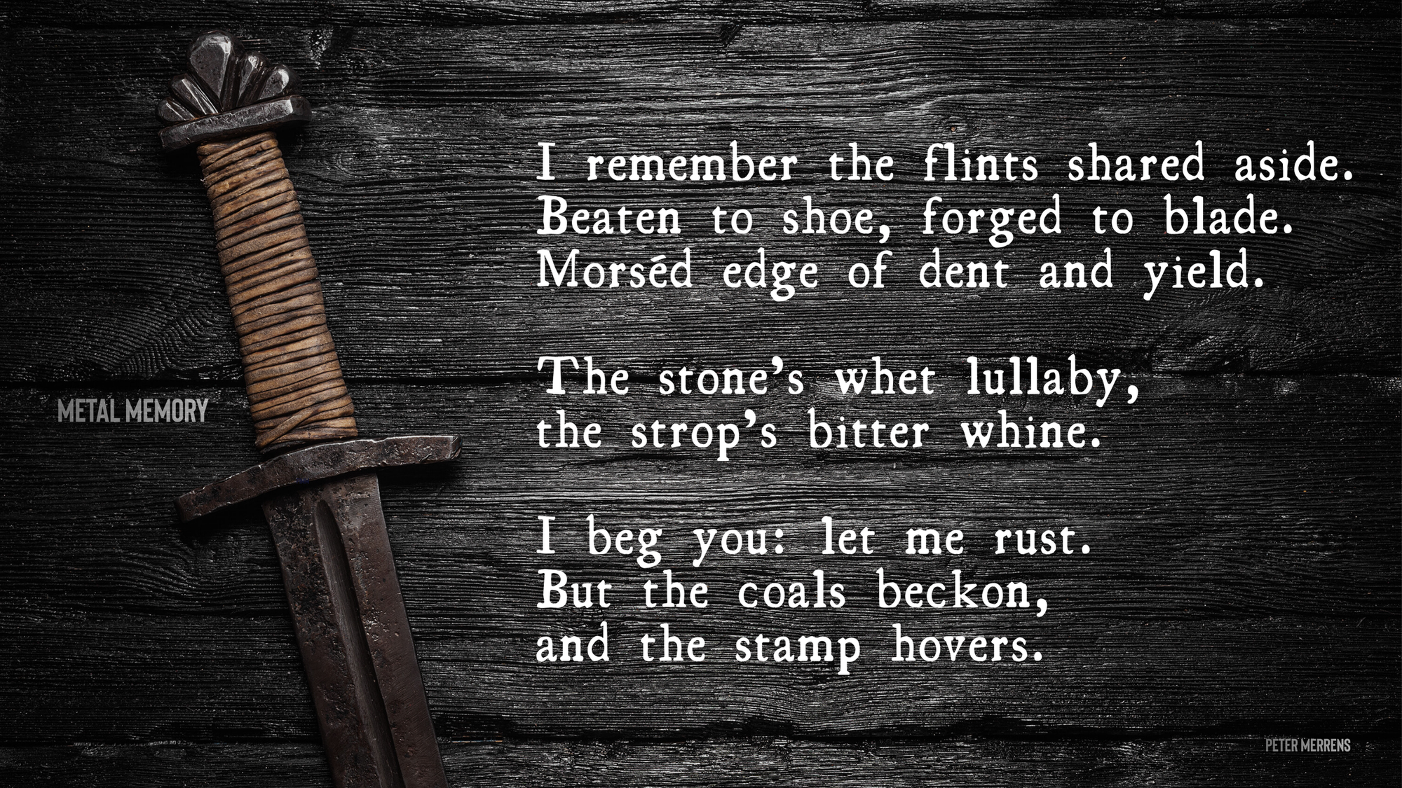 The poem comes from three thoughts. First: that duty can grind a person down, yet still find a way to call them back. Second: that metal never truly disappears — every atom of iron in a blade is older than the solar system itself. And lastly: that weapons are, in the end, innocent. It’s the wielders who carry the guilt.